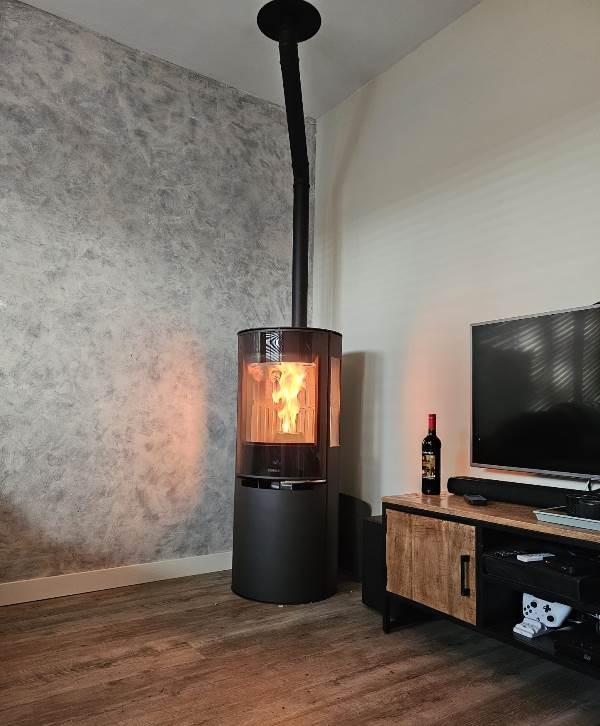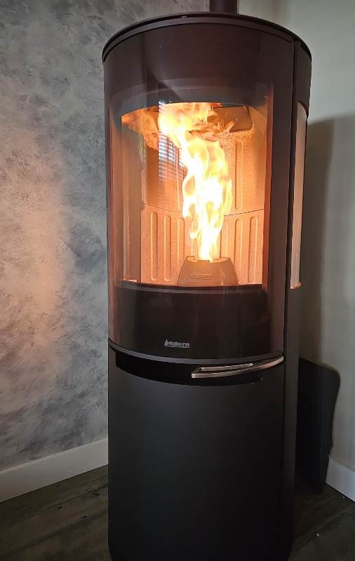 De prachtige Aduro P5 Lux pelletkachel brand al goed in Assen. De vlammen zijn goed te zien en de elegante glazen deur voegt een vleugje luxe toe aan de woonkamer. Zie eens hoe de hond geniet van de warmte. Het voordeel van pelletkachels is dat ze een hoog rendement hebben en de mogelijkheid van geautomatiseerde instellingen. Daardoor veroveren ze de harten van velen. Geen gedoe meer met constant bijvullen, zoals bij een houtkachel. Zorg gewoon dat het reservoir gevuld is en de kachel regelmatig wordt schoongemaakt en de rest verloopt moeiteloos volgens het ingestelde programma. Vertrek gerust naar je werk, wetende dat je 's avonds thuiskomt in een behaaglijk warm huis.